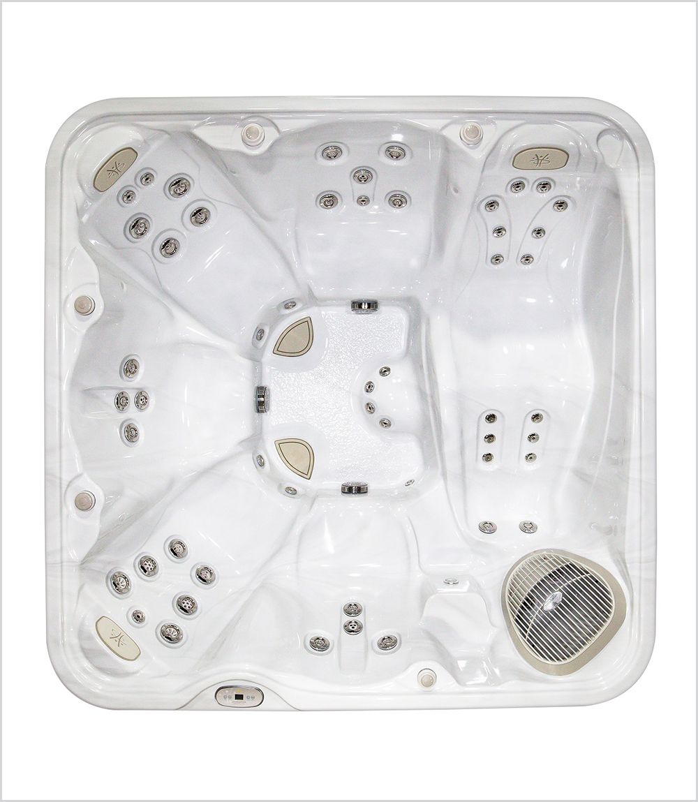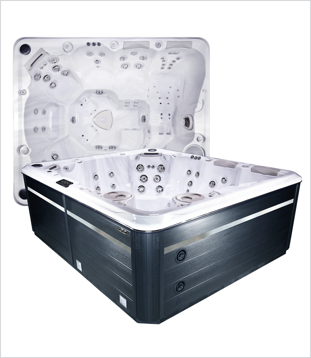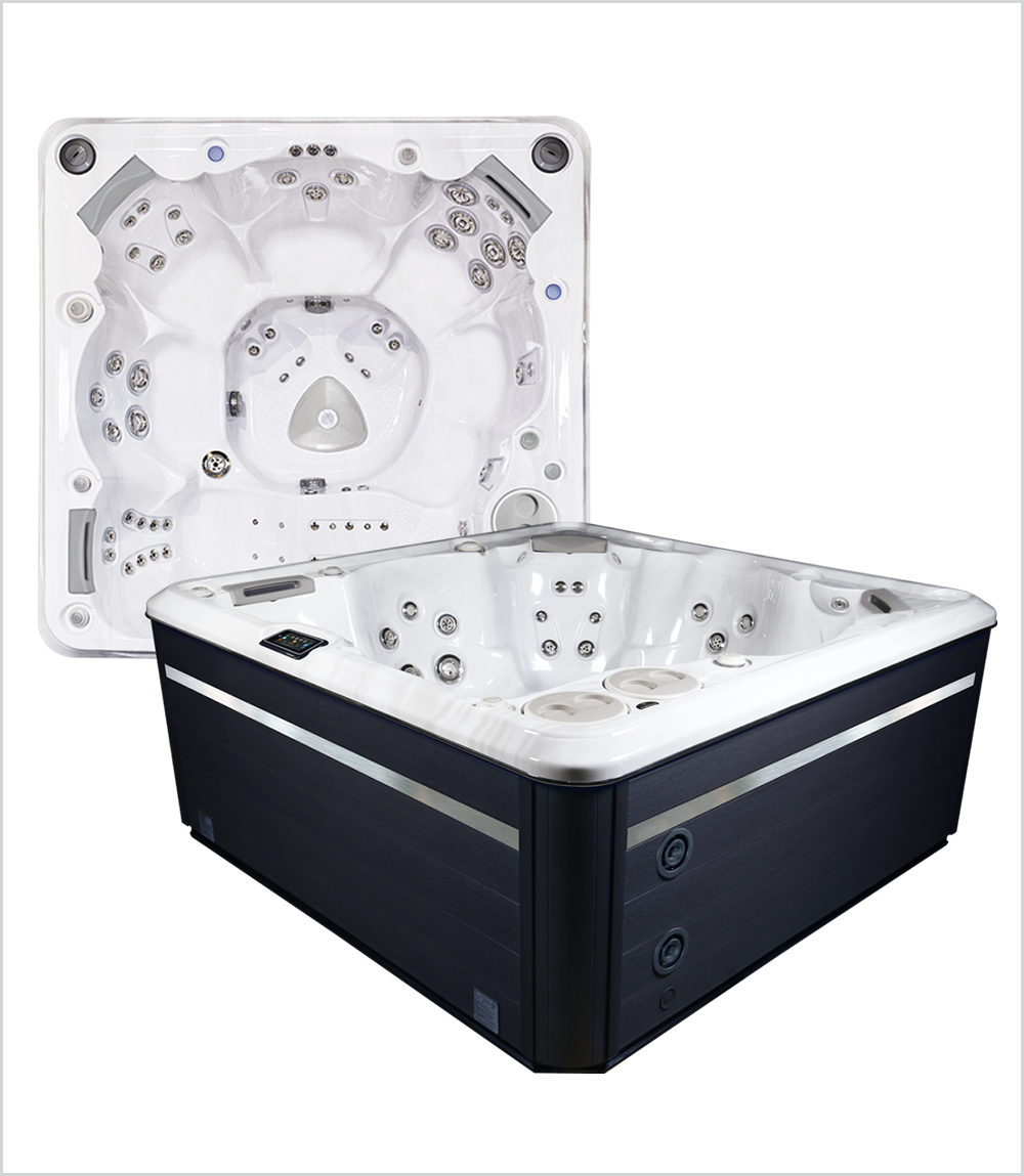 This tub has a generous size for seating up to six. It's a luxury experience with deep seats and full-body massage with exclusive zone therapy, multi-level seating, moon lights, and aquablade waterfalls.